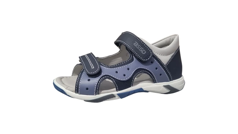 Az Asso szandálok a hazai gyártású gyerekcipők élvonalát képviselik, ötvözve a tradíciót a modern elvárásokkal. Ez a 31-35-ös méretben elérhető modell valódi, puha bőrből készült, amely tartósságot és kiváló komfortérzetet nyújt. A sötétkék alapszínt világosabb kék betétek és fehér tűzések teszik dinamikussá.