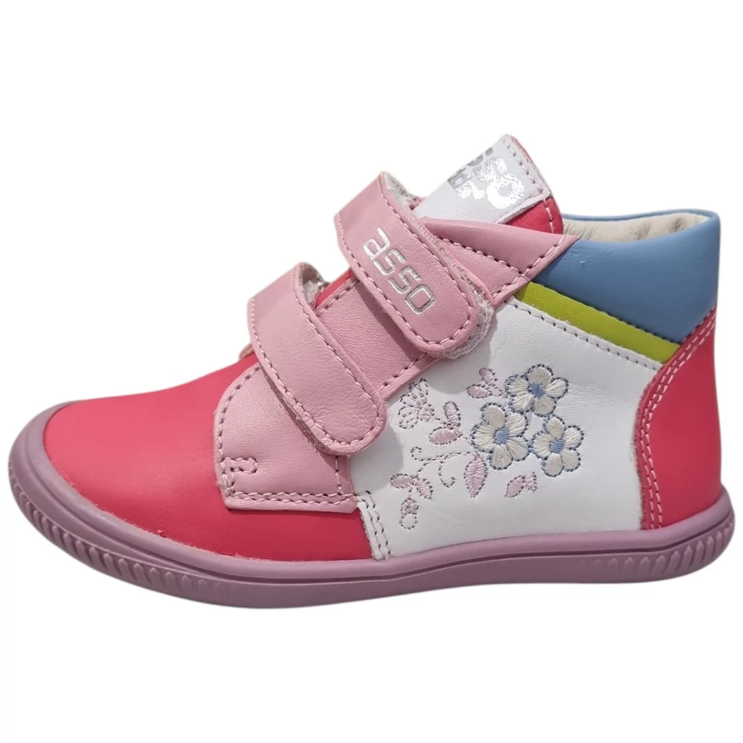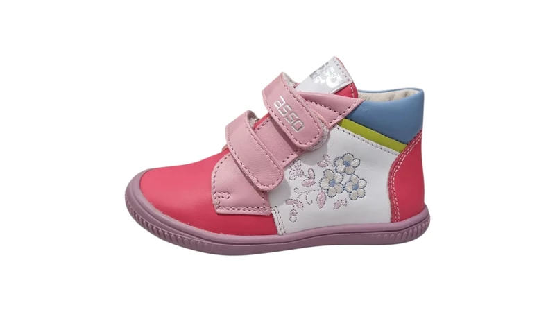 Az Asso hazai gyártású cipői a gyermeklábak anatómiáját szem előtt tartva készülnek. Ez a 24-es méretű modell prémium minőségű bőrből készült, ahol az élénk pink orr-rész és sarok szépen harmonizál a fehér oldalsó panelekkel. A cipő oldalát díszítő, finom kidolgozású kék-fehér virágos hímzés teszi igazán különlegessé ezt a lábbelit.