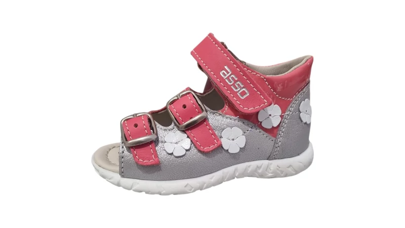 Az Asso szandálok a magyar szülők kedvencei, hiszen ötvözik a divatos megjelenést az ortopédiai szempontból fontos kialakítással. Ez a modell prémium minőségű ezüstszínű bőrből készült, amelyet élénk pink lakkozott részletek és apró, fehér virágdíszek tesznek igazán kislányossá. A szandál zárt kérge stabilan tartja a bokát, megelőzve annak befelé dőlését.