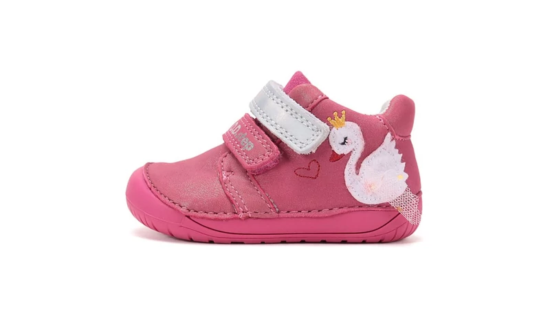 A D.D.Step barefoot (mezítlábas) termékcsaládja úgy lett kialakítva, hogy a lehető legközelebb hozza a természetes járás élményét. Ez a hot pink modell nemcsak látványos a sarkán lévő koronás hattyúval és a csillogó ezüst felső tépőzárral, hanem minden szakmai elvárásnak megfelel, ami a fejlődő lábak védelméhez szükséges.