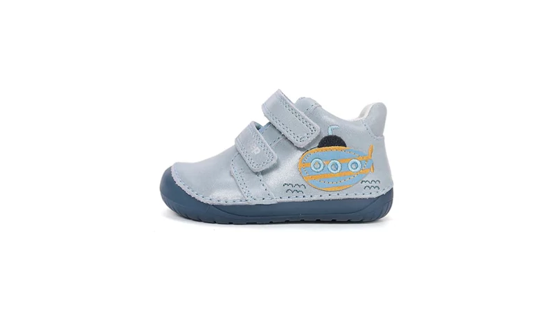 A D.D.Step barefoot vonala a "mezítlábas" szabadság élményét nyújtja, miközben maximális védelmet biztosít. Ez az Oceanic fantázianevű modell selymes fényű, világoskék valódi bőrből készült, oldalán egy vidám, sárga tengeralattjáró hímzéssel. A barefoot kialakítás lényege, hogy a cipő orra tágas, így a lábujjak szabadon szétterülhetnek, a talp pedig rendkívül vékony és minden irányban hajlékony, segítve az egyensúlyérzék és a lábizomzat fejlődését.