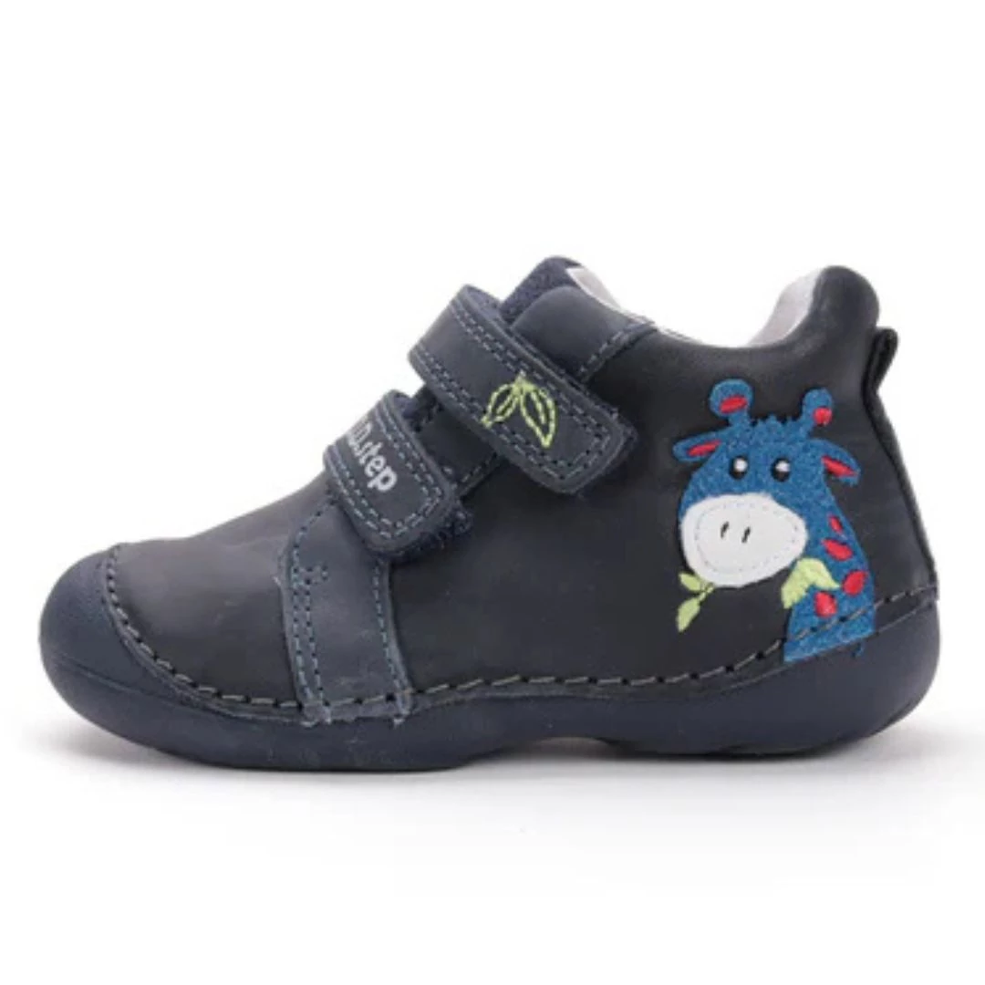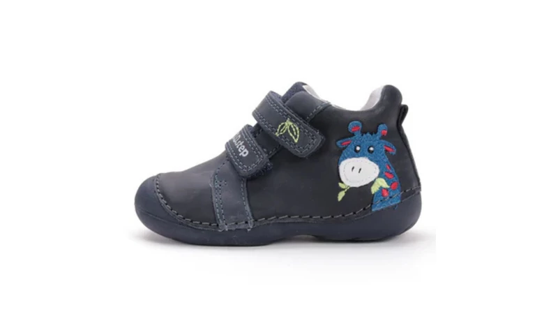 Vidám társ az első lépésekhez és a játékhoz! Ez a sötétkék DDStep bőrcipő mókás zsiráf mintával, hajlékony talppal és megerősített orrvédővel vigyáz a kis lábakra a tavaszi és őszi séták során.