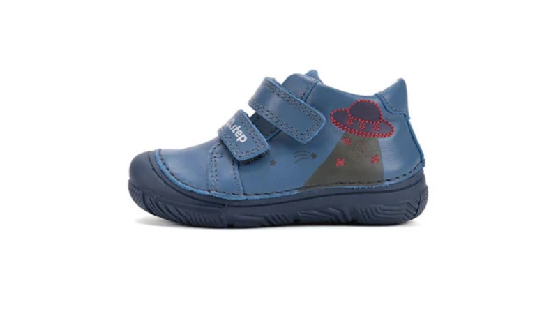 A DDStep első lépés kollekciója a "barefoot" (mezítlábas) irányzat elveit követi: a cipő orra széles, hogy a lábujjak kényelmesen elférjenek, talpa pedig minden irányban rendkívül hajlékony. Ez a modell prémium minőségű, királykék valódi bőrből készült, amely puhán simul a lábra. A vidám, piros hímzett repülő csészealj és a csillagok nemcsak látványosak, de tartós díszei is a lábbelinek, amelyek jól bírják az aktív igénybevételt.