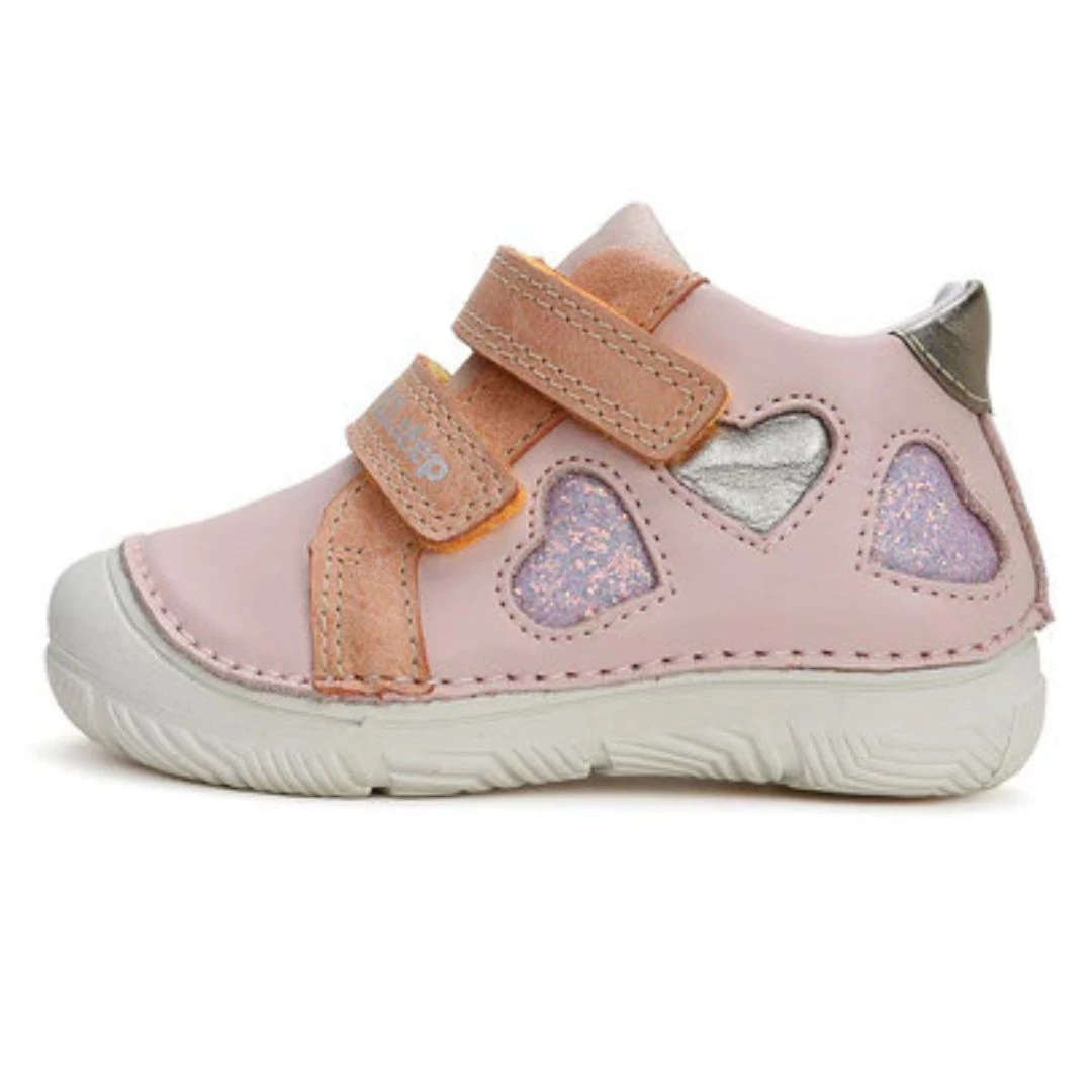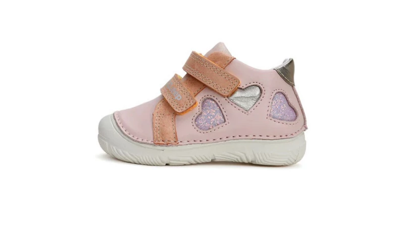 Az első cipő kiválasztása mérföldkő minden kisgyermek életében. A DDStep Első Lépés (First Step) szériája (S082-es modell) a legmagasabb szakértelemmel készült, hogy támogassa a 20-25-ös méretű lábacskák fejlődését. A lágy rózsaszín bőrt három különböző stílusú szív díszíti: egy csillogó lila, egy ezüstös és egy hímzett kontúrú, melyek minden kislányt elvarázsolnak.