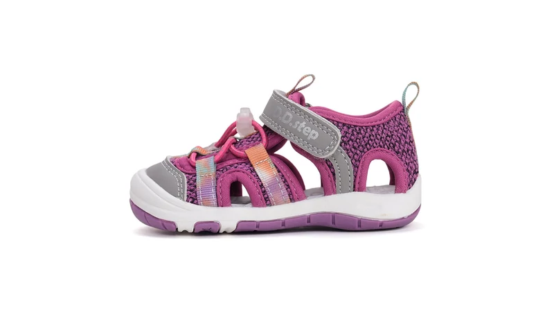 A D.D.Step Aqua sorozata kifejezetten a nyári, vizes környezetben történő aktív használatra lett kifejlesztve. Ez a 26-31-es méretben elérhető modell speciális technikai hálós anyagból készült, amely nem tartja magában a vizet, és rendkívül gyorsan megszárad a napon. A mályva színű felsőrészt színes, színátmenetes pántok és szürke fényvisszaverő részletek teszik modernné és biztonságossá.