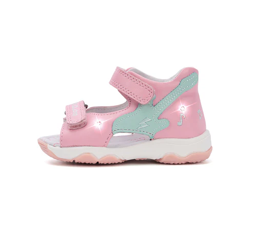 A DDStep világító talpú modelljei a technológiát és a maximális kényelmet ötvözik. Ez a világos rózsaszín modell fényes lakk hatású felsőrésszel készült, melyet egy menta színű hímzett gitár és ezüstös hangjegyek díszítenek. A legizgalmasabb funkciója a beépített LED panel, amely mozgás hatására villogni kezd, így a gyerekek számára élménnyé válik minden egyes megtett méter. A szandál zárt sarokrésze stabil tartást ad a még fejlődésben lévő lábaknak.