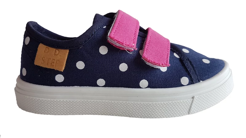 - A cipő színe sötétkék, pink , fehér pöttyökkel van díszítve.