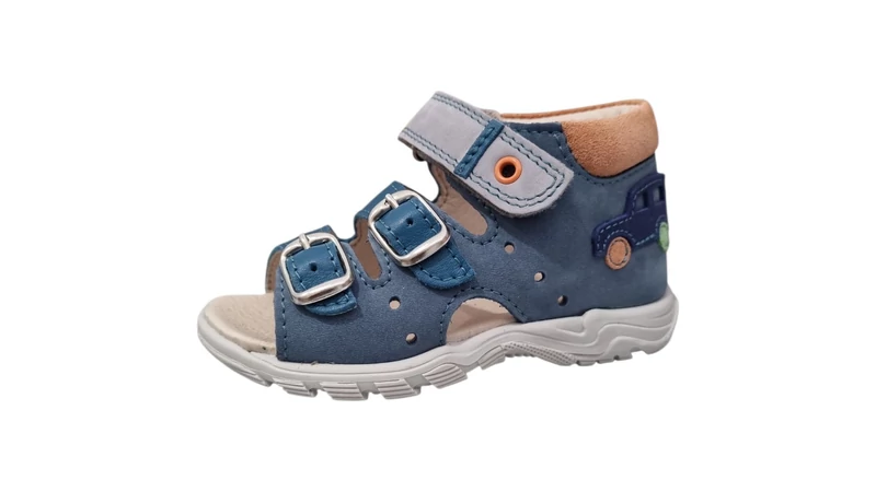A Linea gyermekcipők a tartósságukról és kényelmes kialakításukról ismertek. Ez a 21-30-as méretben elérhető szandál puha nubuk bőr felsőrésszel készült, amely egyszerre elegáns és ellenálló az aktív játék során. A sötétkék és világosszürke panelek kombinációját barna bőr sarokrész és egy kontrasztos narancssárga szegecs teszi modernné.