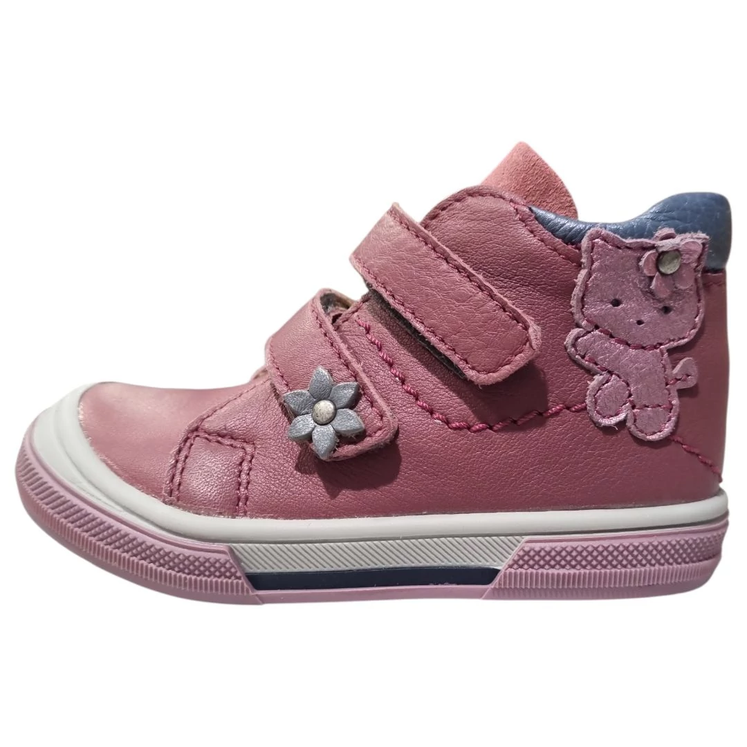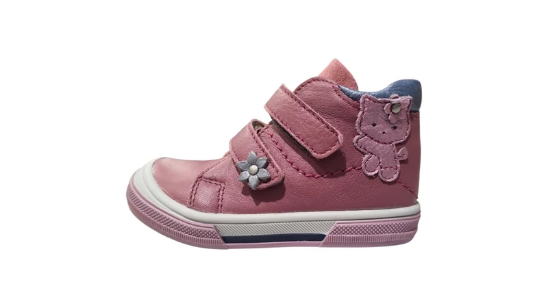 A Linea zárt cipője a praktikumot és a játékos dizájnt hozza el a legkisebbeknek. A strapabíró sötétrózsaszín bőr felsőrészt egy szürke virág díszíti a tépőzáron, a sarokrészen pedig egy kedves cicás figura teszi teljessé a megjelenést. Ez a cipő ideális választás az átmeneti időszakra, legyen szó óvodáról vagy kinti játékról.