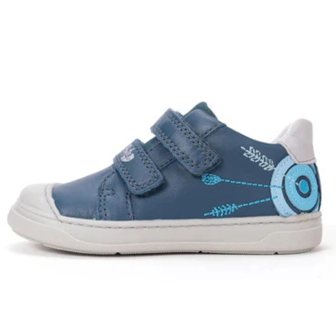A Ponte20 szupinált cipői elengedhetetlenek azon gyermekek számára, akiknél a boka befelé dőlése tapasztalható. A talp belső oldalán elhelyezett 5 mm-es döntés észrevétlenül korrigálja a lábfej helyzetét, tehermentesítve a bokaszalagokat és segítve a helyes járáskép kialakulását. A sötétkék bőr felsőrészt egyedi, világoskék nyíl mintás grafika díszíti, ami igazán sportossá teszi a modellt.