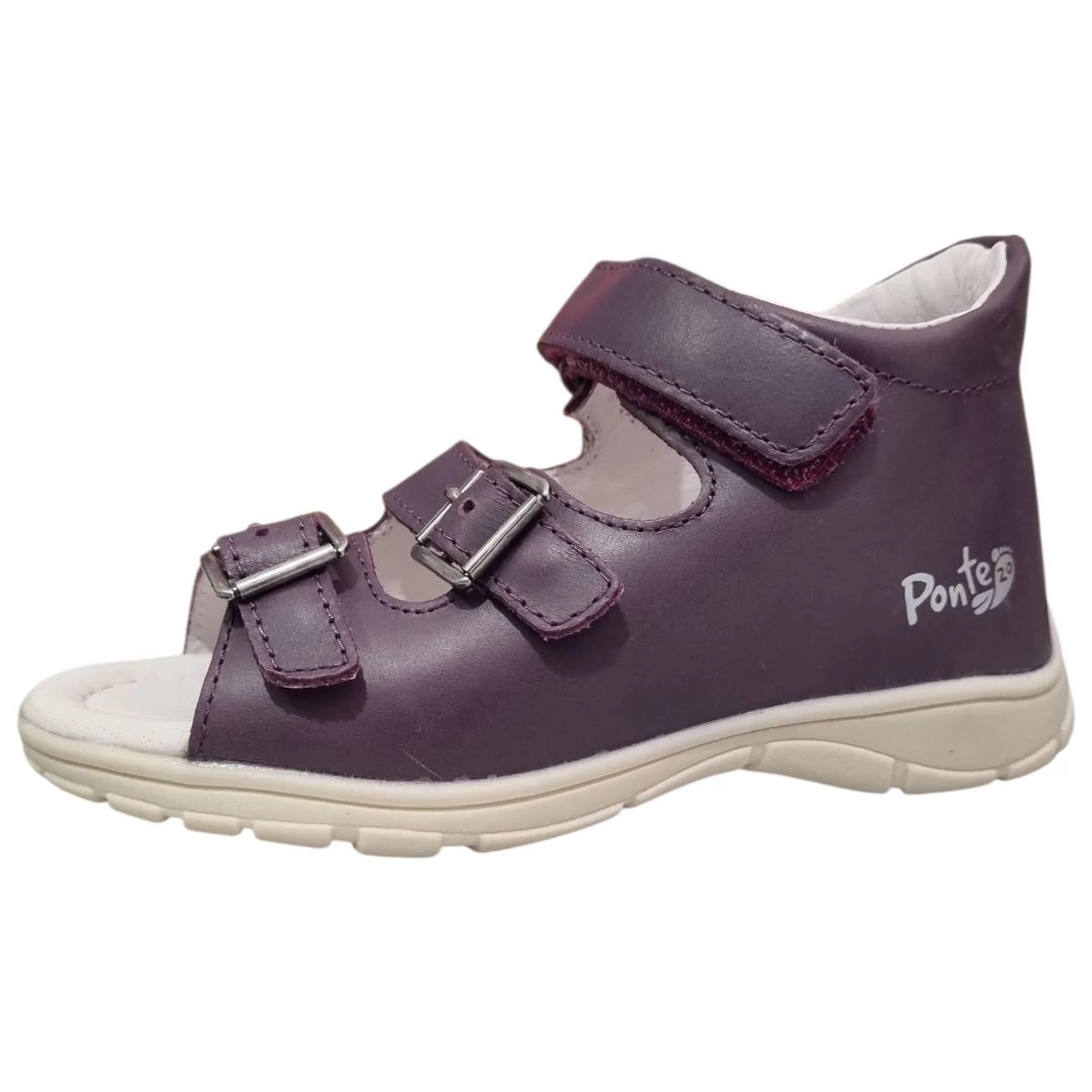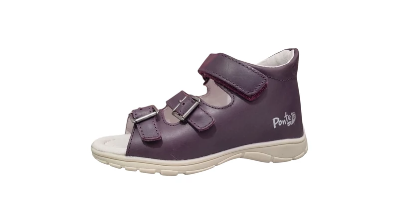 A Ponte20 supinált lábbelik segítenek a befelé dőlő boka korrigálásában, így biztosítva a lábak egészséges fejlődését. Ez a modell mély lila színű valódi bőrből készült, amely tartós, mégis kellően rugalmas a mindennapi viselethez. A szandál sarkán és oldalán található hímzett Ponte20 logó a hitelesített minőség záloga.