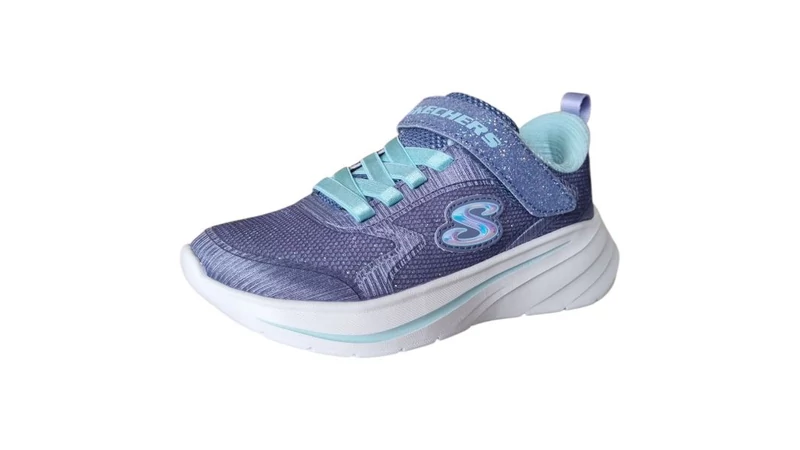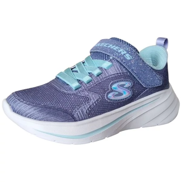 Ez a Skechers sportcipő (303557-LAV modell) a romantikus levendula színt és a modern sportos vonalvezetést ötvözi. A felsőrész finom csillogó bevonata és a holografikus "S" logó különleges megjelenést kölcsönöz, miközben a cipő technikai felépítése a legmagasabb szintű kényelmet biztosítja az aktív kislányok számára.
