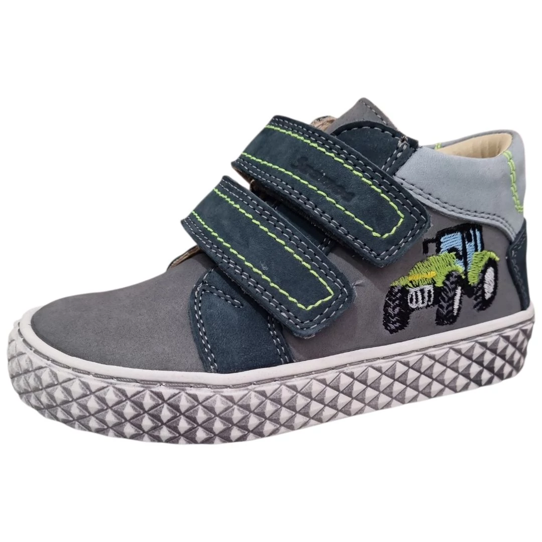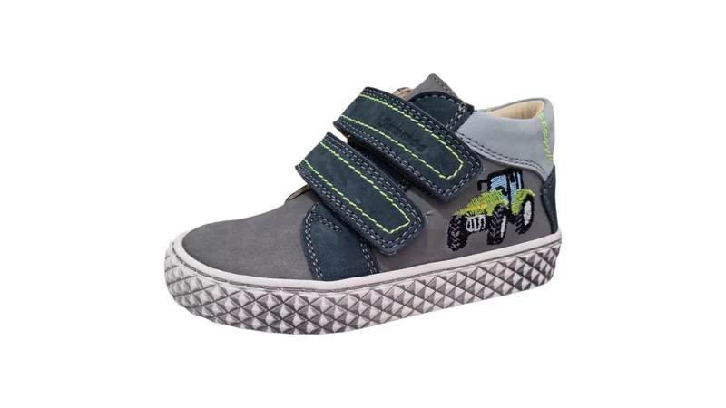 A Szamos cipők a hazai gyártású lábbelik legjobbjai közé tartoznak, ahol a szakértelem modern designnal párosul. Ez a 25-30-as méretállású modell prémium minőségű szürke nubuk bőrből készült, amelyet sötétkék bőr betétek és élénkzöld dísztűzések tesznek sportossá. A cipő oldalát díszítő, részletgazdag hímzett traktor minta garantáltan elnyeri a kis gépmesterek tetszését.