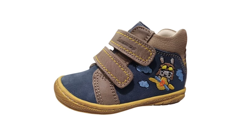 A Szamos cipők híresek a precíz kidolgozásukról és lábbarát kialakításukról. Ez a modell kiváló minőségű nubukbőrből készült, amely egyszerre nyújt rugalmasságot és tartósságot a mindennapi játék során. A sötétkék alapszínt meleg barna részletek és élénk sárga varrások teszik egyedivé, az oldalán található repülőgépet vezető nyuszi hímzés pedig garantáltan a kisfiúk kedvencévé teszi a cipőt.