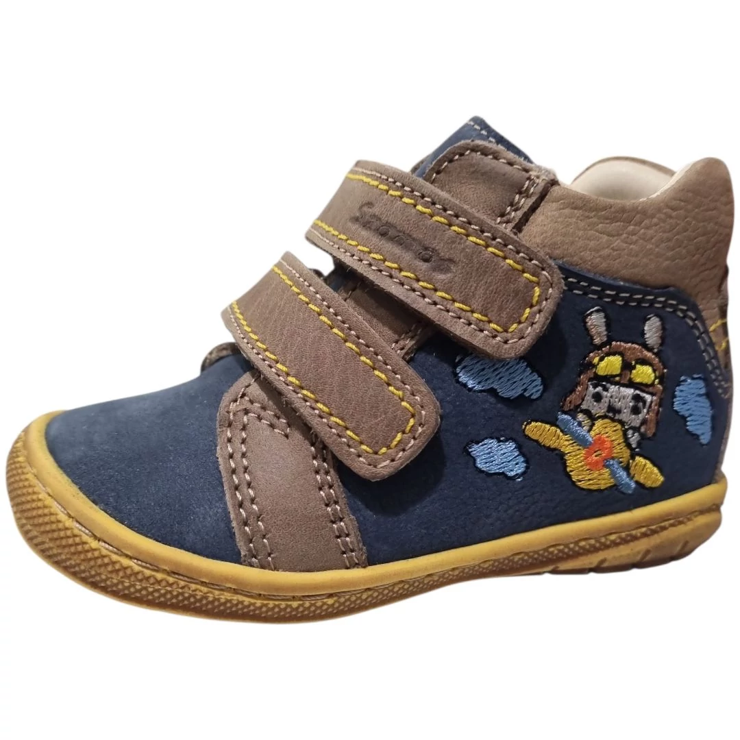 Készen állunk a felszállásra! Ez a repülős Szamos kisfiú bőrcipő sötétkék és barna bőrből, sárga kontrasztvarrással és stabil tartással támogatja a kicsik biztonságos járásfejlődését.