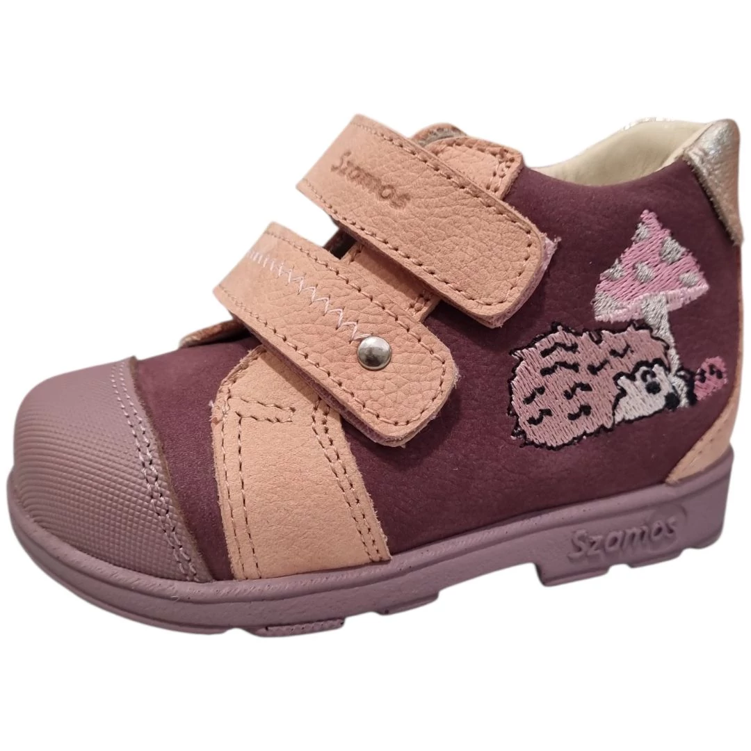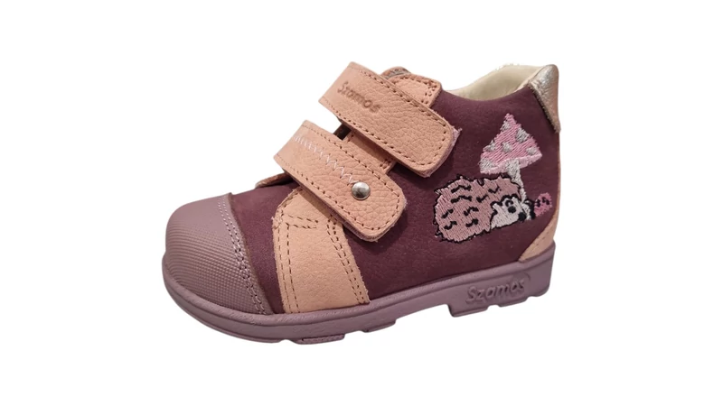 A Szamos supinált modelljei orvostechnikai eszköznek minősülnek, melyeket kifejezetten a gyermekek lábának egészséges fejlődéséhez terveztek. Ez a kisméretű modell prémium minőségű valódi nubuk bőrből készült, ahol a mélyebb mályva alapszínt lágyabb rózsaszín bőr betétek egészítik ki. A cipő külső oldalán egy részletgazdag, hímzett süni látható egy pöttyös gombával, ami egyedi és barátságos megjelenést kölcsönöz a lábbelinek.