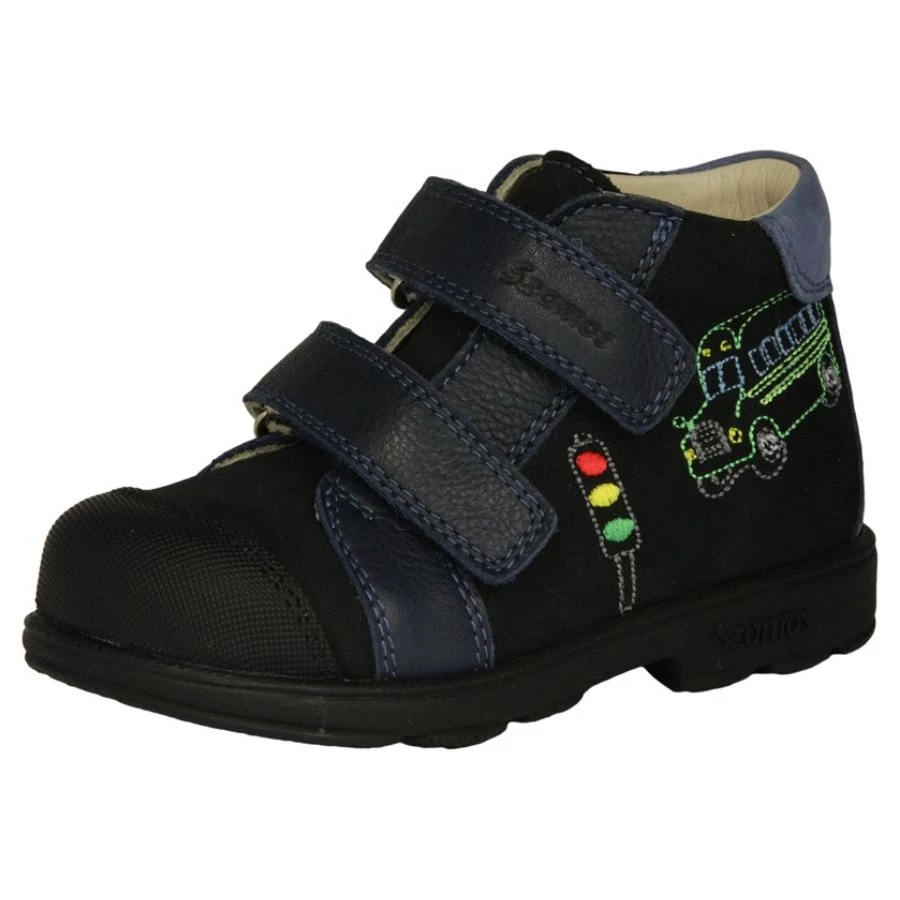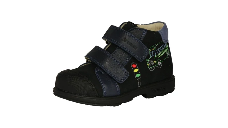 Ez a sportos, fekete és sötétkék Szamos Kölyök supinált cipő a járművekért rajongó fiúk nagy kedvence lesz. Az oldalán található vidám, hímzett busz és közlekedési lámpa minta mellett a cipő minden eleme a lábak egészséges fejlődését szolgálja. Ideális választás az átmeneti időszakra, óvodába vagy iskolába.