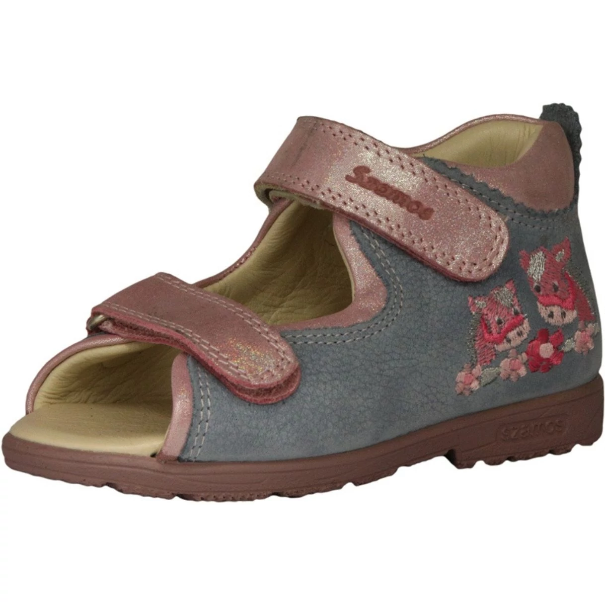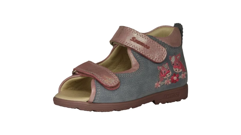 Ez a különleges színvilágú kislány szandál a Szamos tradicionális supinált (döntött) technológiájával készült. A modell legfontosabb jellemzője a sarok belső részén elhelyezett 5 mm-es döntés, amely megakadályozza a boka befelé dőlését, és támogatja a helyes testtartás kialakulását. A mályva alapszínt a kontrasztos kék pántok teszik egyedivé, a sarokrészen található hímzett lovacskák pedig játékos stílust kölcsönöznek a lábbelinek.