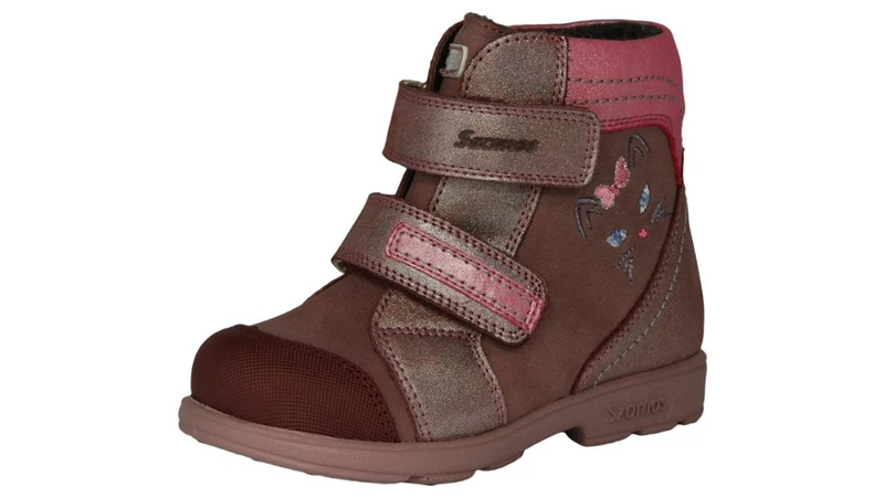 Ez a bakancs egy igazi téli álom: a bordó és rózsaszín árnyalatok csillogó felületekkel és egy tündéri cica hímzéssel találkoznak. De a bájos külső egy komoly belsőt takar! Ezt a cipőt kifejezetten a befelé dőlő bokájú gyermekeknek tervezték, hogy a téli kalandok ne csak melegek, de egészségesek és szárazak is legyenek.
