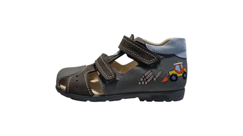 Ez a szürke-kék színvilágú kisfiú szandál a Szamos tradicionális minőségét képviseli. A modell legfontosabb jellemzője a supinált (döntött) sarkú talp, amely segít korrigálni a befelé dőlő bokát, és támogatja a lábfej egészséges fejlődését. A szandál oldalát egy hímzett munkagép (markoló) és rönkök díszítik, ami azonnal kedvenccé teszi a cipőt a gyerekek körében. A zárt orr-rész extra védelmet nyújt a lábujjaknak kismotorozás vagy intenzív játék közben.